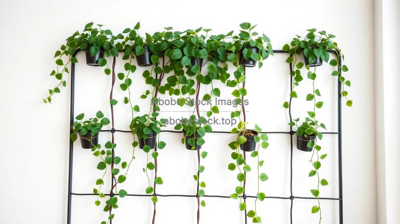 Indoor climbing plant trained on a decorative trellis, white wall, bright natural light