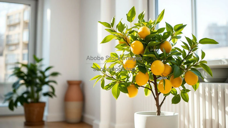 Indoor lemon tree in a ceramic pot, modern white interior, sunlight from large windo