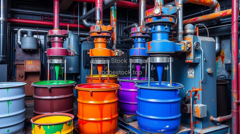 Industrial paint mixing facility with colorful barrels mechanical mixers saturated tones semi abstract