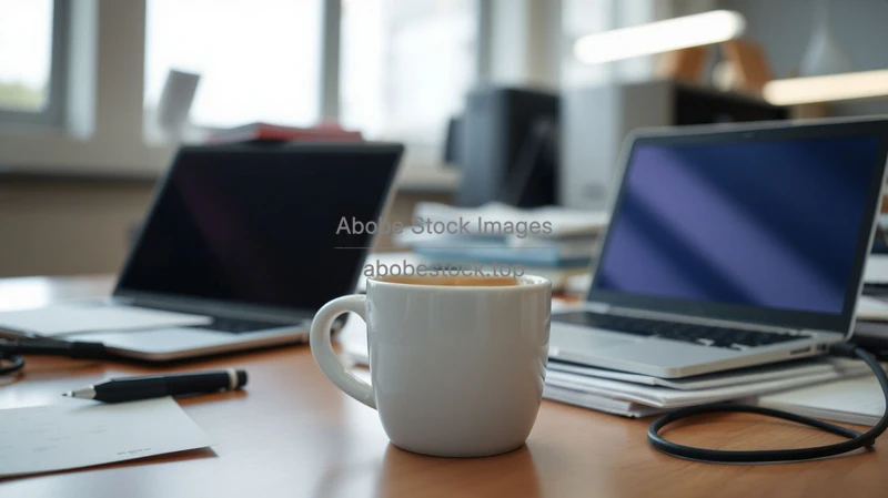 Instant coffee in simple mug on messy office desk, laptop and documents, fluorescent lighting