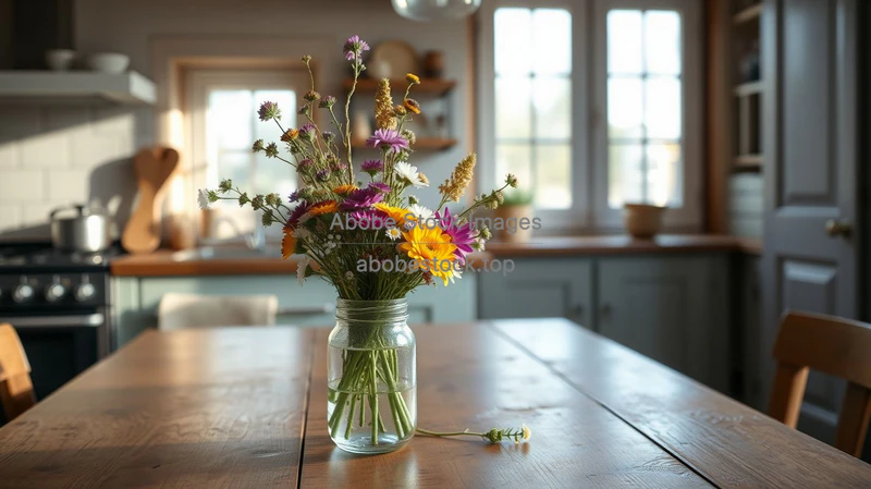 Kitchen table with wildflower bouquet in a jar, rustic interior, gentle morning light