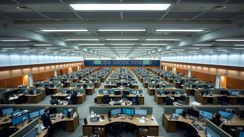 Large corporate open floor with rows of identical desks, overhead view, fluorescent lighting