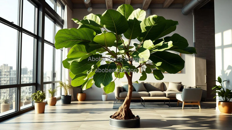 Large fiddle leaf fig tree in a sunlit corner of a modern apartment, concrete floor, floor to ceiling windows, ultra realistic