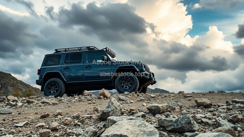 Luxury off road vehicle on rocky mountain terrain cloudy dramatic sky