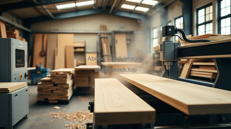 Modern woodworking factory with CNC routers cutting wooden boards sawdust in the air warm lighting