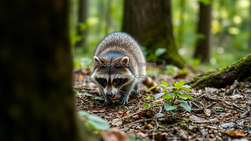 Raccoon exploring forest floor
