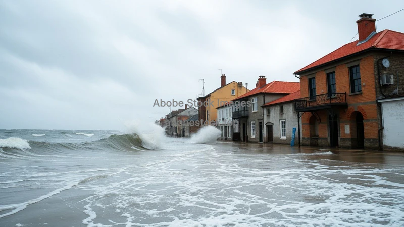 Sea level rise flooding an old coastal town waves crashing into historic buildings photojournalism