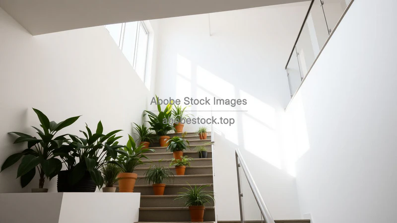 Sunlit stairwell with plants on each step, white walls, modern railing, airy architecture