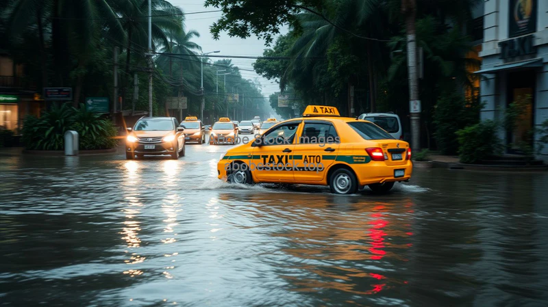 Taxi in a monsoon flooded street water halfway up wheels tropical city