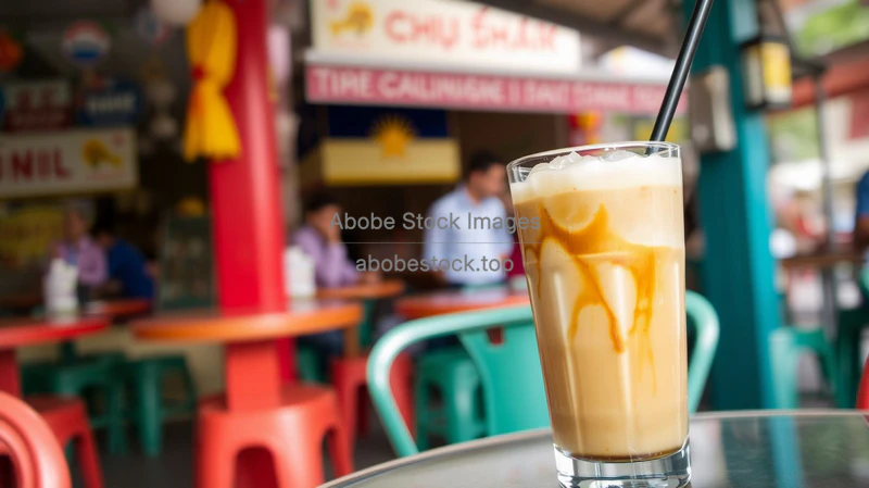 Vietnamese iced coffee with condensed milk in tall glass, street cafe setting, vibrant colors