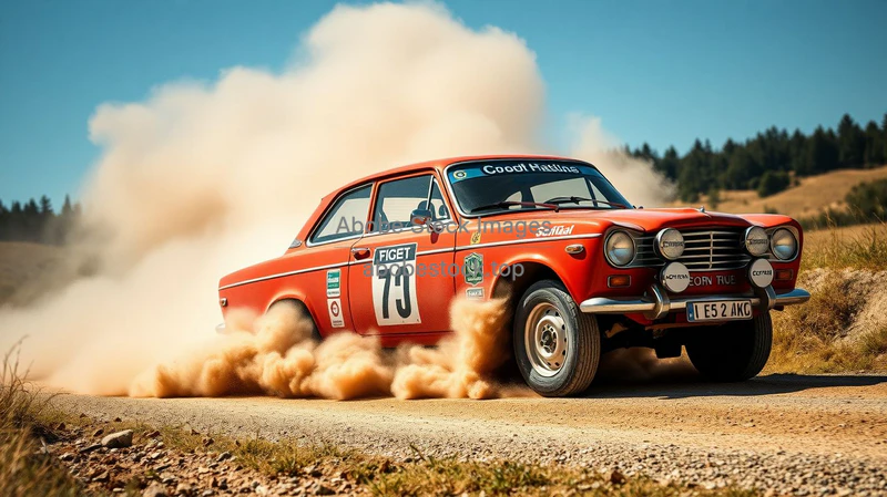 Vintage rally car kicking up dust on a gravel road dynamic action
